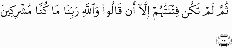 Then there will be no [excuse upon] examination except they will say, "By Allah , our Lord, we were not those who associated."