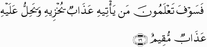 And you are going to know who will get a punishment that will disgrace him [on earth] and upon whom will descend an enduring punishment [in the Hereafter]."