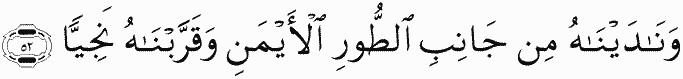And We called him from the side of the mount at [his] right and brought him near, confiding [to him].