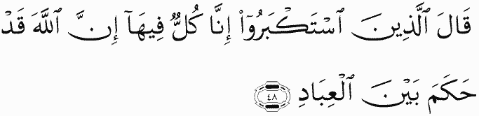 Those who had been arrogant will say, "Indeed, all [of us] are in it. Indeed, Allah has judged between the servants."