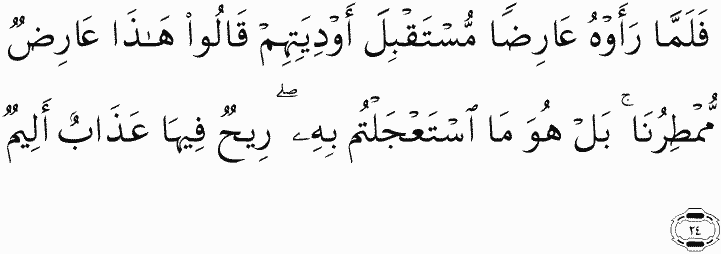 And when they saw it as a cloud approaching their valleys, they said, "This is a cloud bringing us rain!" Rather, it is that for which you were impatient: a wind, within it a painful punishment,
