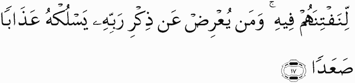 So We might test them therein. And whoever turns away from the remembrance of his Lord He will put into arduous punishment.