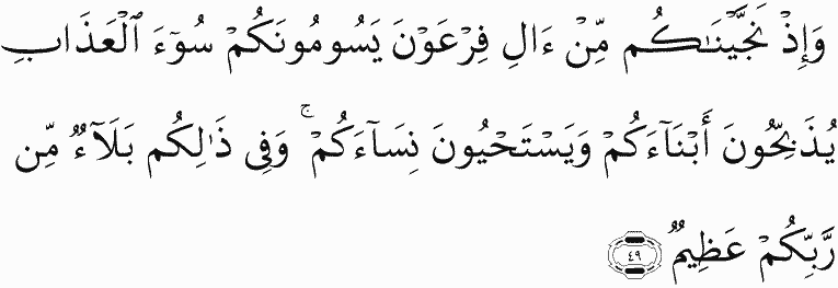 And [recall] when We saved your forefathers from the people of Pharaoh, who afflicted you with the worst torment, slaughtering your [newborn] sons and keeping your females alive. And in that was a great trial from your Lord.