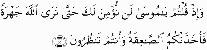 And [recall] when you said, "O Moses, we will never believe you until we see Allah outright"; so the thunderbolt took you while you were looking on.