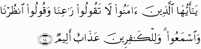 O you who have believed, say not [to Allah 's Messenger], "Ra'ina" but say, "Unthurna" and listen. And for the disbelievers is a painful punishment.