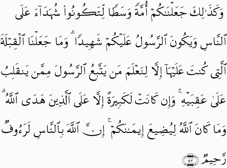 And thus we have made you a just community that you will be witnesses over the people and the Messenger will be a witness over you. And We did not make the qiblah which you used to face except that We might make evident who would follow the Messenger from who would turn back on his heels. And indeed, it is difficult except for those whom Allah has guided. And never would Allah have caused you to lose your faith. Indeed Allah is, to the people, Kind and Merciful.