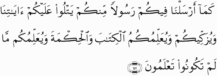 Just as We have sent among you a messenger from yourselves reciting to you Our verses and purifying you and teaching you the Book and wisdom and teaching you that which you did not know.