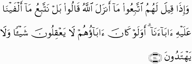And when it is said to them, "Follow what Allah has revealed," they say, "Rather, we will follow that which we found our fathers doing." Even though their fathers understood nothing, nor were they guided?