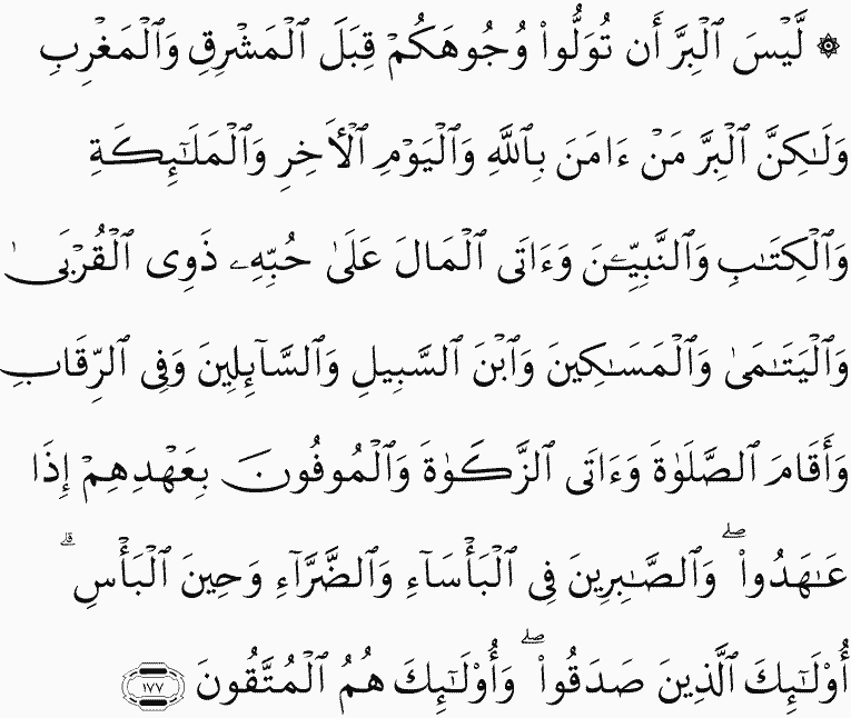 Righteousness is not that you turn your faces toward the east or the west, but [true] righteousness is [in] one who believes in Allah , the Last Day, the angels, the Book, and the prophets and gives wealth, in spite of love for it, to relatives, orphans, the needy, the traveler, those who ask [for help], and for freeing slaves; [and who] establishes prayer and gives zakah; [those who] fulfill their promise when they promise; and [those who] are patient in poverty and hardship and during battle. Those are the ones who have been true, and it is those who are the righteous.