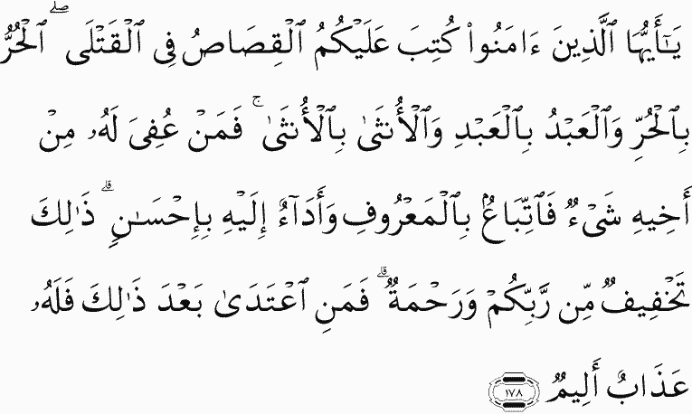 O you who have believed, prescribed for you is legal retribution for those murdered - the free for the free, the slave for the slave, and the female for the female. But whoever overlooks from his brother anything, then there should be a suitable follow-up and payment to him with good conduct. This is an alleviation from your Lord and a mercy. But whoever transgresses after that will have a painful punishment.