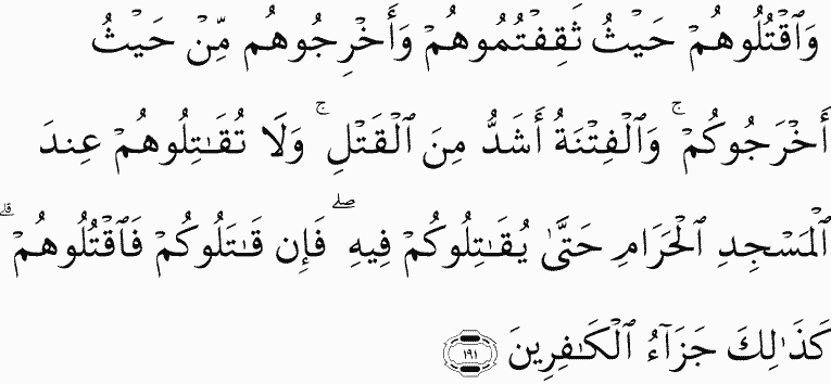 And kill them wherever you overtake them and expel them from wherever they have expelled you, and fitnah is worse than killing. And do not fight them at al-Masjid al- îaram until they fight you there. But if they fight you, then kill them. Such is the recompense of the disbelievers.
