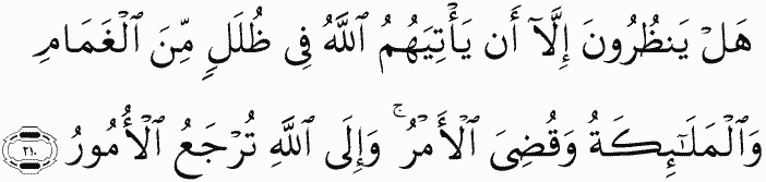Do they await but that Allah should come to them in covers of clouds and the angels [as well] and the matter is [then] decided? And to Allah [all] matters are returned.
