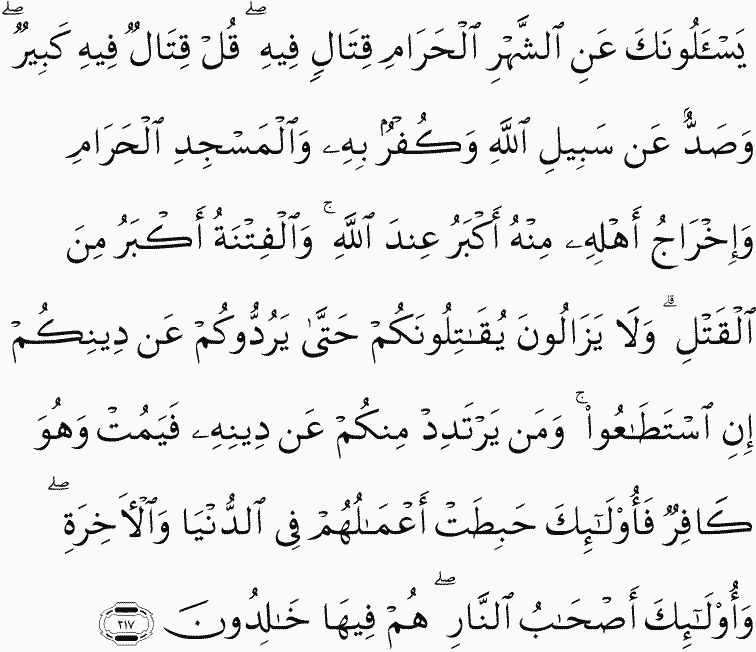 They ask you about the sacred month - about fighting therein. Say, "Fighting therein is great [sin], but averting [people] from the way of Allah and disbelief in Him and [preventing access to] al-Masjid al-haram and the expulsion of its people therefrom are greater [evil] in the sight of Allah . And fitnah is greater than killing." And they will continue to fight you until they turn you back from your religion if they are able. And whoever of you reverts from his religion [to disbelief] and dies while he is a disbeliever - for those, their deeds have become worthless in this world and the Hereafter, and those are the companions of the Fire, they will abide therein eternally.