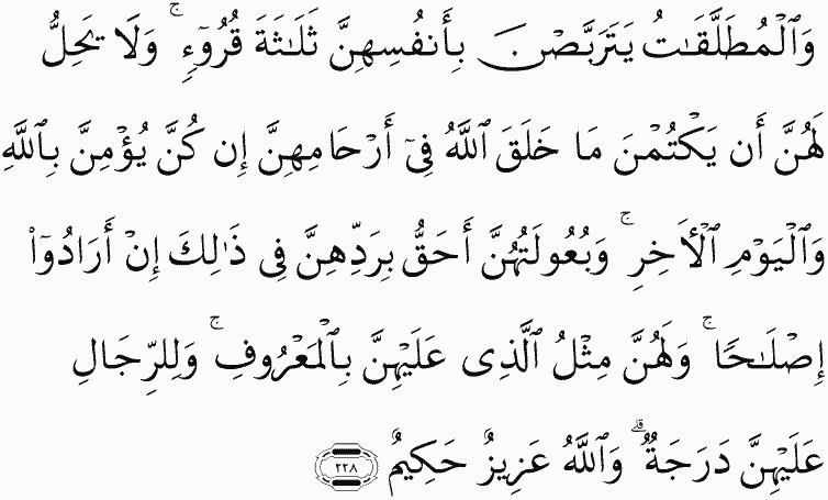 Divorced women remain in waiting for three periods, and it is not lawful for them to conceal what Allah has created in their wombs if they believe in Allah and the Last Day. And their husbands have more right to take them back in this [period] if they want reconciliation. And due to the wives is similar to what is expected of them, according to what is reasonable. But the men have a degree over them [in responsibility and authority]. And Allah is Exalted in Might and Wise.