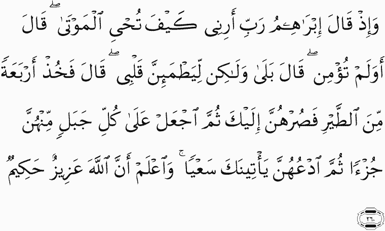 And [mention] when Abraham said, "My Lord, show me how You give life to the dead." [ Allah ] said, "Have you not believed?" He said, "Yes, but [I ask] only that my heart may be satisfied." [ Allah ] said, "Take four birds and commit them to yourself. Then [after slaughtering them] put on each hill a portion of them; then call them - they will come [flying] to you in haste. And know that Allah is Exalted in Might and Wise."