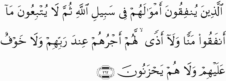 Those who spend their wealth in the way of Allah and then do not follow up what they have spent with reminders [of it] or [other] injury will have their reward with their Lord, and there will be no fear concerning them, nor will they grieve.