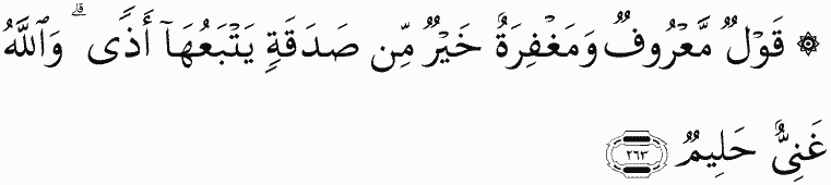 Kind speech and forgiveness are better than charity followed by injury. And Allah is Free of need and Forbearing.