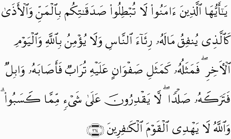 O you who have believed, do not invalidate your charities with reminders or injury as does one who spends his wealth [only] to be seen by the people and does not believe in Allah and the Last Day. His example is like that of a [large] smooth stone upon which is dust and is hit by a downpour that leaves it bare. They are unable [to keep] anything of what they have earned. And Allah does not guide the disbelieving people.