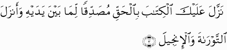 He has sent down upon you, [O Muhammad], the Book in truth, confirming what was before it. And He revealed the Torah and the Gospel.