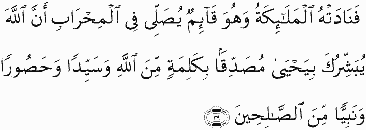So the angels called him while he was standing in prayer in the chamber, "Indeed, Allah gives you good tidings of John, confirming a word from Allah and [who will be] honorable, abstaining [from women], and a prophet from among the righteous."