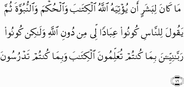 It is not for a human [prophet] that Allah should give him the Scripture and authority and prophethood and then he would say to the people, "Be servants to me rather than Allah ," but [instead, he would say], "Be pious scholars of the Lord because of what you have taught of the Scripture and because of what you have studied."