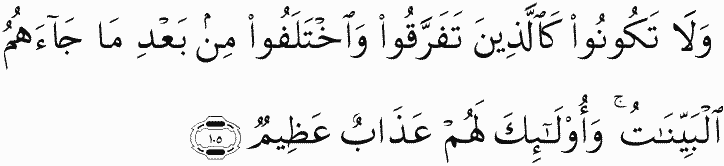 And do not be like the ones who became divided and differed after the clear proofs had come to them. And those will have a great punishment.