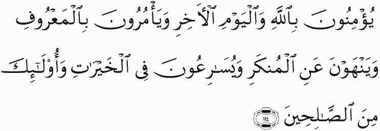 They believe in Allah and the Last Day, and they enjoin what is right and forbid what is wrong and hasten to good deeds. And those are among the righteous.