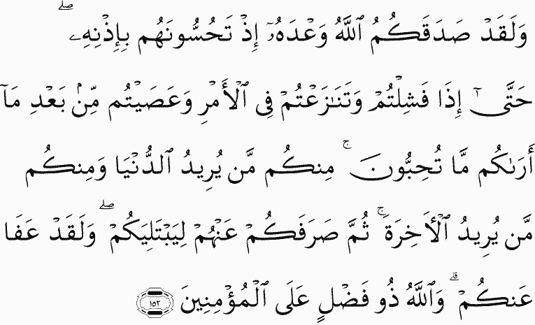 And Allah had certainly fulfilled His promise to you when you were killing the enemy by His permission until [the time] when you lost courage and fell to disputing about the order [given by the Prophet] and disobeyed after He had shown you that which you love. Among you are some who desire this world, and among you are some who desire the Hereafter. Then he turned you back from them [defeated] that He might test you. And He has already forgiven you, and Allah is the possessor of bounty for the believers.