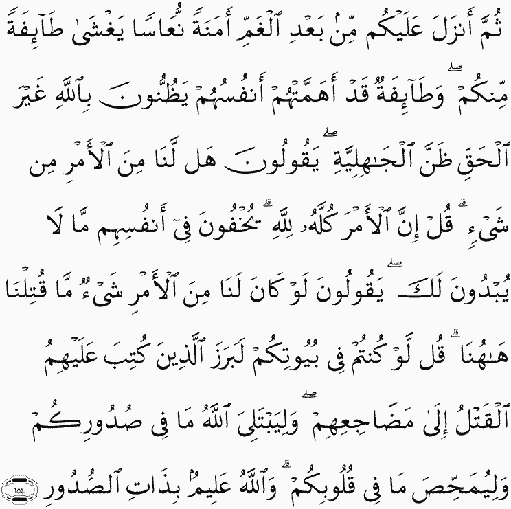 Then after distress, He sent down upon you security [in the form of] drowsiness, overcoming a faction of you, while another faction worried about themselves, thinking of Allah other than the truth - the thought of ignorance, saying, "Is there anything for us [to have done] in this matter?" Say, "Indeed, the matter belongs completely to Allah ." They conceal within themselves what they will not reveal to you. They say, "If there was anything we could have done in the matter, some of us would not have been killed right here." Say, "Even if you had been inside your houses, those decreed to be killed would have come out to their death beds." [It was] so that Allah might test what is in your breasts and purify what is in your hearts. And Allah is Knowing of that within the breasts.