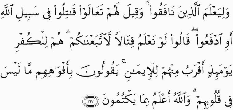 And that He might make evident those who are hypocrites. For it was said to them, "Come, fight in the way of Allah or [at least] defend." They said, "If we had known [there would be] fighting, we would have followed you." They were nearer to disbelief that day than to faith, saying with their mouths what was not in their hearts. And Allah is most Knowing of what they conceal -