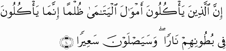 Indeed, those who devour the property of orphans unjustly are only consuming into their bellies fire. And they will be burned in a Blaze.