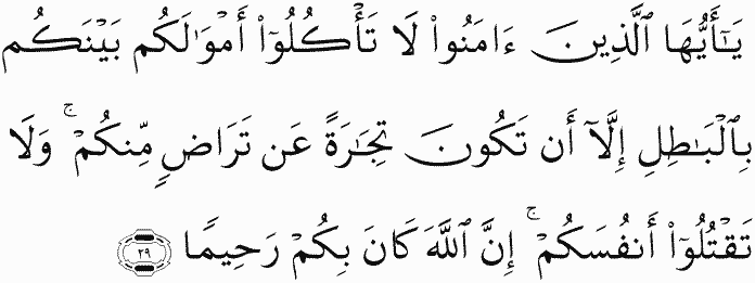 O you who have believed, do not consume one another's wealth unjustly but only [in lawful] business by mutual consent. And do not kill yourselves [or one another]. Indeed, Allah is to you ever Merciful.