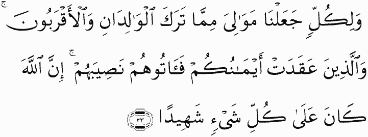 And for all, We have made heirs to what is left by parents and relatives. And to those whom your oaths have bound [to you] - give them their share. Indeed Allah is ever, over all things, a Witness.