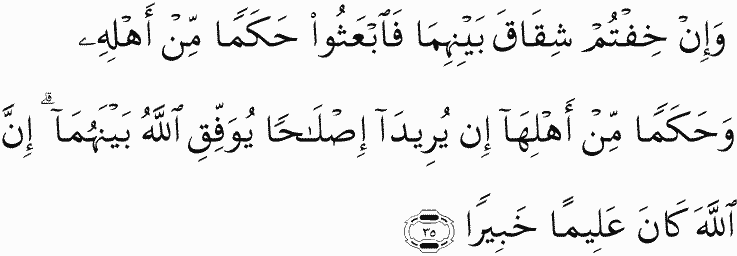 And if you fear dissension between the two, send an arbitrator from his people and an arbitrator from her people. If they both desire reconciliation, Allah will cause it between them. Indeed, Allah is ever Knowing and Acquainted [with all things].