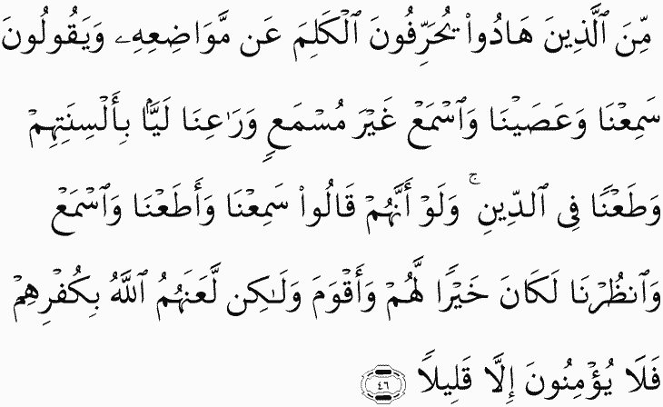 Among the Jews are those who distort words from their [proper] usages and say, "We hear and disobey" and "Hear but be not heard" and "Ra'ina," twisting their tongues and defaming the religion. And if they had said [instead], "We hear and obey" and "Wait for us [to understand]," it would have been better for them and more suitable. But Allah has cursed them for their disbelief, so they believe not, except for a few.