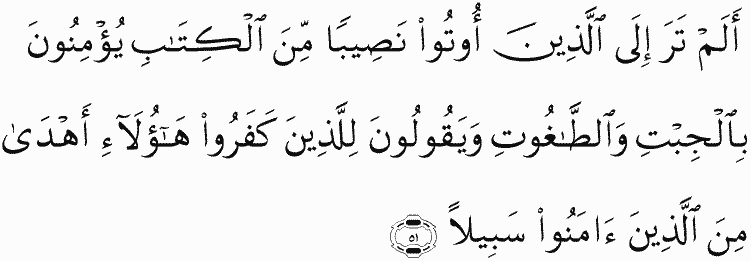 Have you not seen those who were given a portion of the Scripture, who believe in superstition and false objects of worship and say about the disbelievers, "These are better guided than the believers as to the way"?