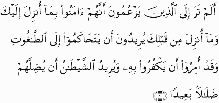 Have you not seen those who claim to have believed in what was revealed to you, [O Muhammad], and what was revealed before you? They wish to refer legislation to Taghut, while they were commanded to reject it; and Satan wishes to lead them far astray.