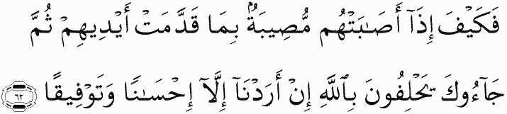So how [will it be] when disaster strikes them because of what their hands have put forth and then they come to you swearing by Allah , "We intended nothing but good conduct and accommodation."