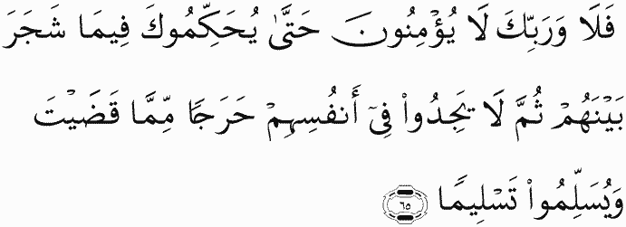 But no, by your Lord, they will not [truly] believe until they make you, [O Muhammad], judge concerning that over which they dispute among themselves and then find within themselves no discomfort from what you have judged and submit in [full, willing] submission.