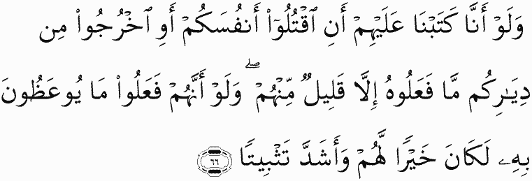 And if We had decreed upon them, "Kill yourselves" or "Leave your homes," they would not have done it, except for a few of them. But if they had done what they were instructed, it would have been better for them and a firmer position [for them in faith].