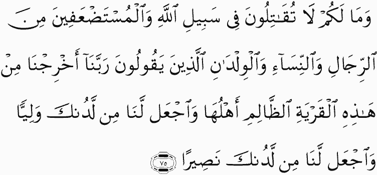And what is [the matter] with you that you fight not in the cause of Allah and [for] the oppressed among men, women, and children who say, "Our Lord, take us out of this city of oppressive people and appoint for us from Yourself a protector and appoint for us from Yourself a helper?"
