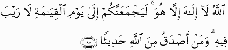 Allah - there is no deity except Him. He will surely assemble you for [account on] the Day of Resurrection, about which there is no doubt. And who is more truthful than Allah in statement.
