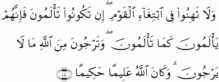 And do not weaken in pursuit of the enemy. If you should be suffering - so are they suffering as you are suffering, but you expect from Allah that which they expect not. And Allah is ever Knowing and Wise.