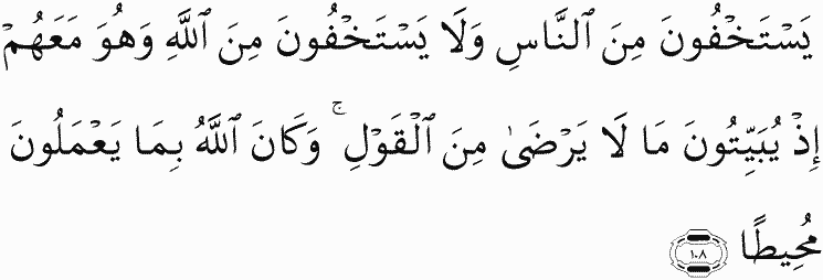 They conceal [their evil intentions and deeds] from the people, but they cannot conceal [them] from Allah , and He is with them [in His knowledge] when they spend the night in such as He does not accept of speech. And ever is Allah , of what they do, encompassing.
