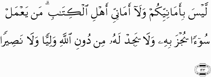 Paradise is not [obtained] by your wishful thinking nor by that of the People of the Scripture. Whoever does a wrong will be recompensed for it, and he will not find besides Allah a protector or a helper.