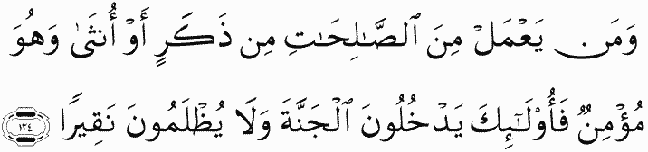 And whoever does righteous deeds, whether male or female, while being a believer - those will enter Paradise and will not be wronged, [even as much as] the speck on a date seed.