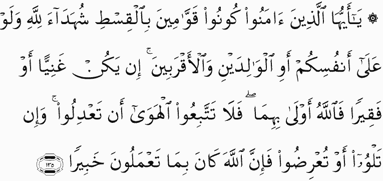 O you who have believed, be persistently standing firm in justice, witnesses for Allah , even if it be against yourselves or parents and relatives. Whether one is rich or poor, Allah is more worthy of both. So follow not [personal] inclination, lest you not be just. And if you distort [your testimony] or refuse [to give it], then indeed Allah is ever, with what you do, Acquainted.