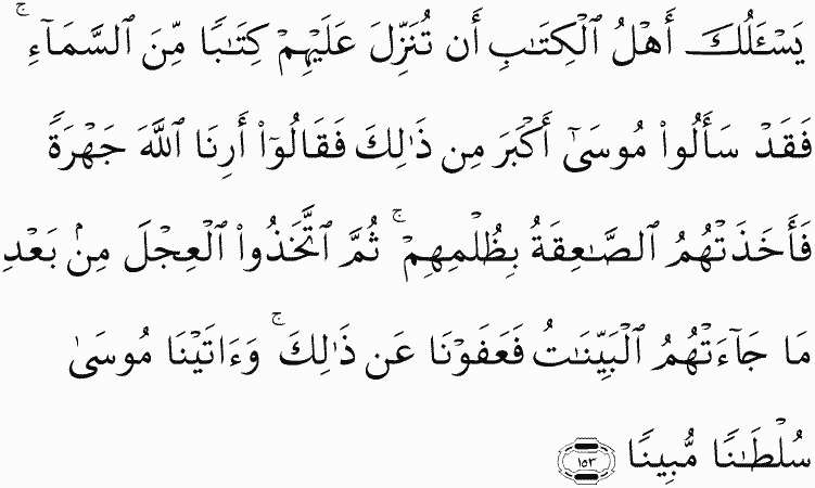 The People of the Scripture ask you to bring down to them a book from the heaven. But they had asked of Moses [even] greater than that and said, "Show us Allah outright," so the thunderbolt struck them for their wrongdoing. Then they took the calf [for worship] after clear evidences had come to them, and We pardoned that. And We gave Moses a clear authority.