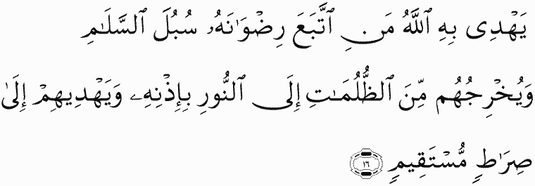 By which Allah guides those who pursue His pleasure to the ways of peace and brings them out from darknesses into the light, by His permission, and guides them to a straight path.