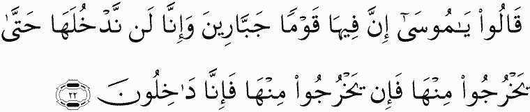 They said, "O Moses, indeed within it is a people of tyrannical strength, and indeed, we will never enter it until they leave it; but if they leave it, then we will enter."